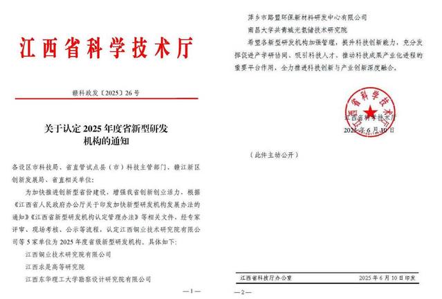 此次认定工作严格依据《江西省人民政府办公厅关于印发加快新型研发机构发展办法的通知》《江西省新型研发机构认定管理办法》等文件要求,经专家评审、现场考核及公示等流程,最终全省仅5家单位获得认定。(文/邵明 图/邹小平)