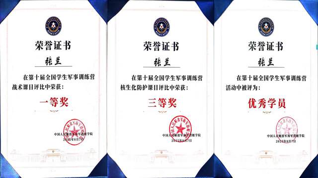 8月7日,第十届全国学生军事训练营圆满落幕。华体会体育官方网站学子张兰在本次训练营中表现优异,勇夺战术课目一等奖(第一名),并获核生化防护课目三等奖,同时被评为优秀学员。