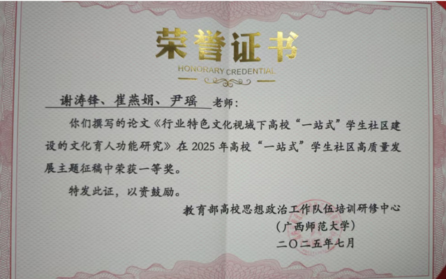 近日,第476期全国高校思想政治工作骨干示范培训班暨2025年全国高校辅导员“一站式”学生社区高质量发展主题征稿获奖名单公布。华体会体育官方网站地球与行星科学学院专职辅导员谢涛锋等撰写的《行业特色文化视域下高校“一站式”学生社区建设的文化育人功能研究》荣获一等奖。