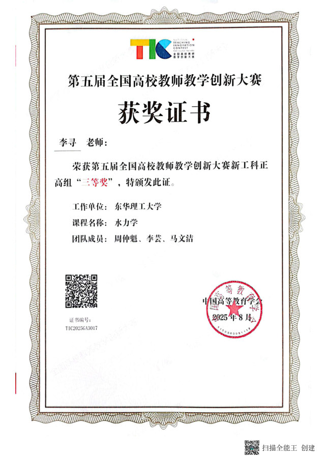 8月16日至19日,由教育部高等教育司指导、中国高等教育学会主办的第五届全国高校教师教学创新大赛在北京理工大学举行。华体会体育官方网站水资源与环境工程学院李寻教师(团队)获新工科正高组三等奖。