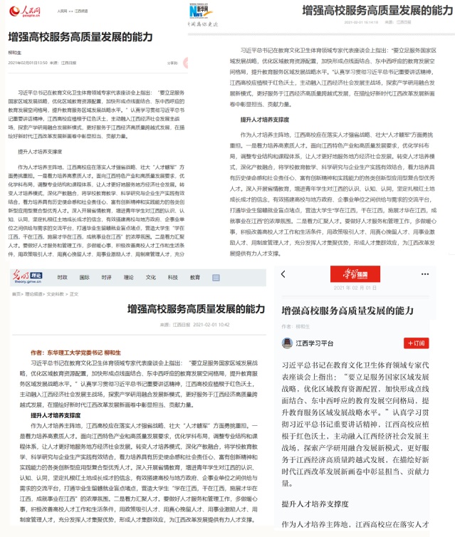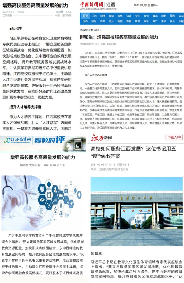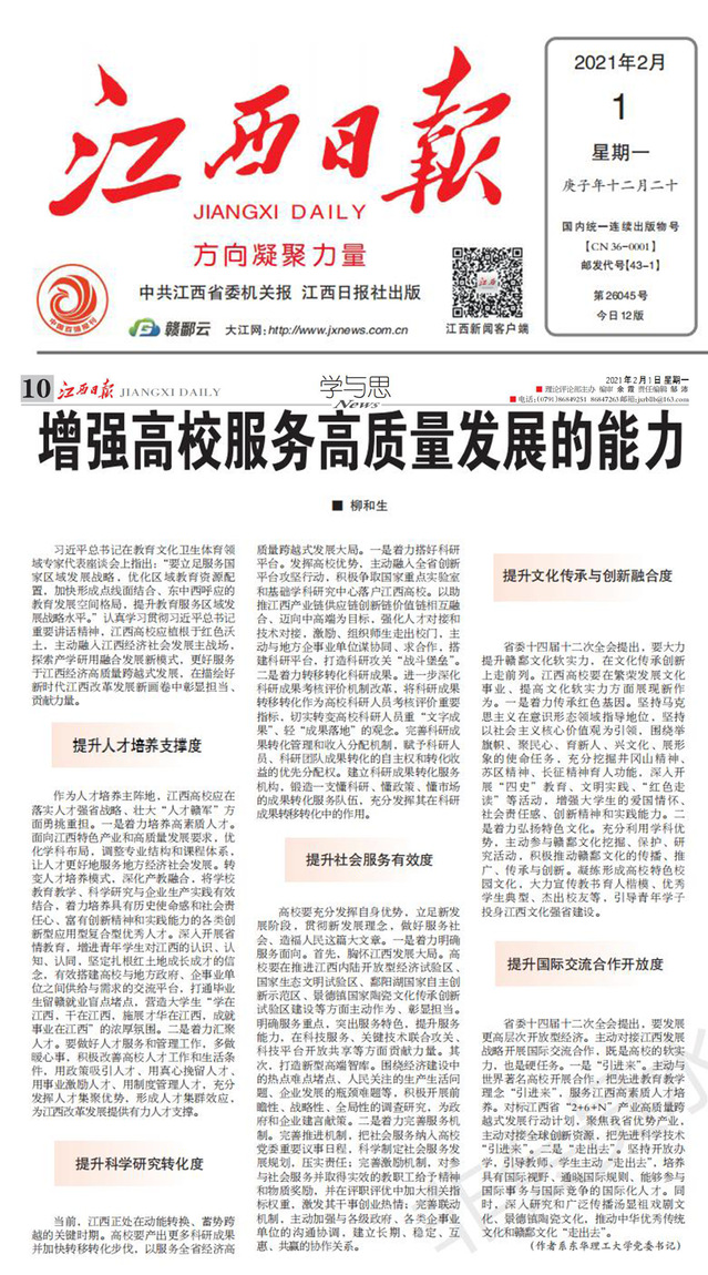 编者按:2月1日,《江西日报》“学与思”版头条刊发我校党委书记柳和生的署名理论文章《增强高校服务高质量发展的能力》。文章指出,江西高校应植根于红色沃土,提升“五度”,做到“十个着力”,主动融入江西经济社会发展主战场,更好服务于江西经济高质量跨越式发展,在描绘好新时代江西改革发展新画卷中彰显担当、贡献力量。文章受到人民网、光明网、新华网、中国新闻网、学习强国、新华社客户端、中国江西网、凤凰网、江西新闻客户端、江西教育网等媒体关注,现将内容转载如下: