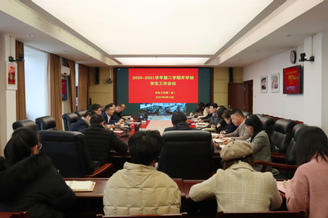 会议传达学习了校党委书记柳和生对新时期做好学生工作提出的总体要求,进行了春季学生心理健康形势研判,对学校学生安全稳定工作做了重要工作提示,并对2021年的学生重点工作做了布置。一以党史学习教育为契机,强化大学生思想引领;二以一院一品为载体,提升学生工作品牌建设;三以智慧化平台为支持,全面提升服务质量;四以综合测评为抓手,推动劳动教育落地;五以辅导员工作室为平台,加强辅导员队伍建设。