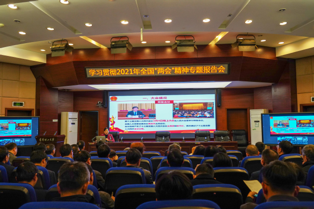 3月22日下午,学校在南昌校区行政办公楼一楼报告厅和抚州校区行政办公楼三楼会议室(视频)同步召开学习贯彻2021年全国“两会”精神专题报告会。在家校领导、全体处级干部、思政课教师、辅导员和学生代表参加会议。校党委副书记刘紫春主持会议。