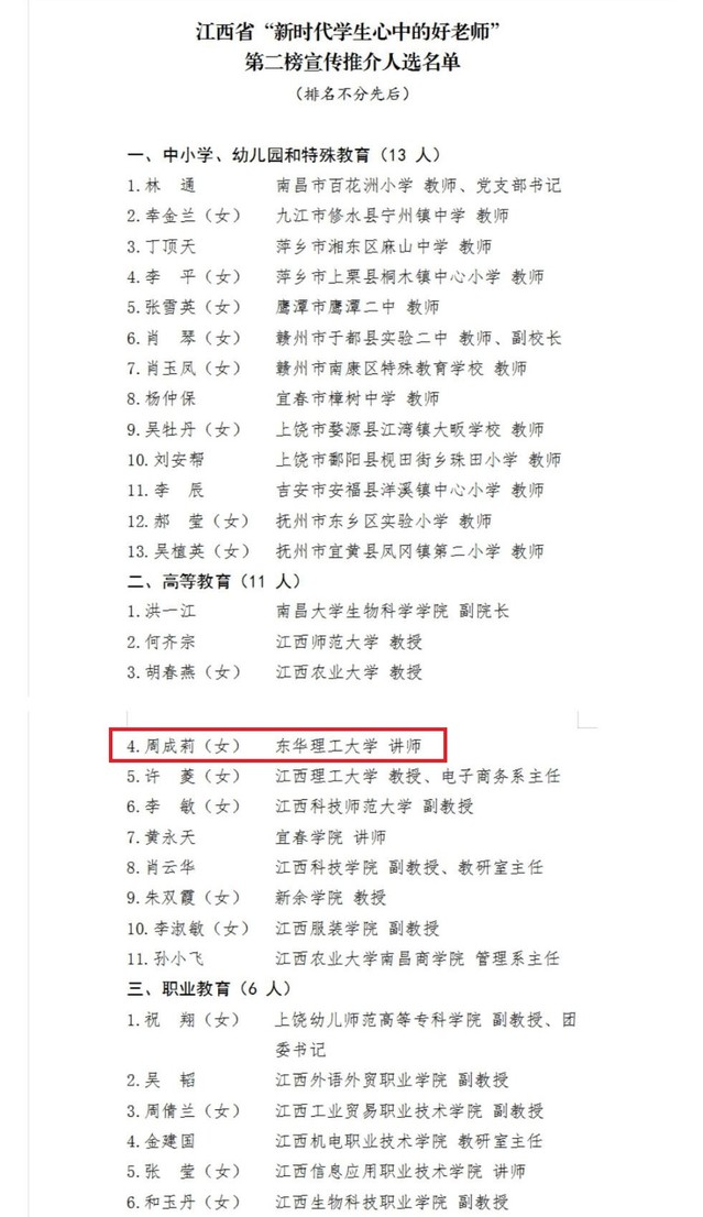 近日,省教育厅公布了江西省“新时代学生心中的好老师”第二榜宣传推介人选名单30名。其中,小学、幼儿园和特殊教育13人,高等教育11人,职业教育6人。我校马克思主义学院副教授周成莉入选,这也是我校教师首次获得该项荣誉。