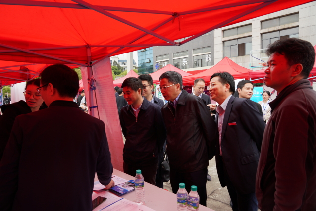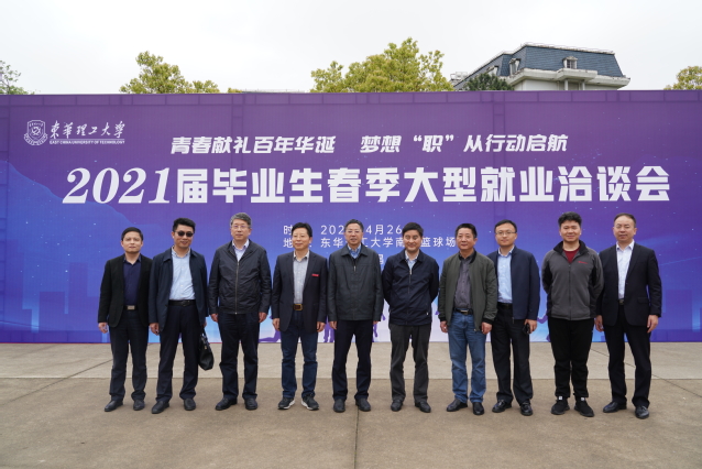 为庆祝中国共产党百年华诞,贯彻落实习近平总书记在党史学习教育动员大会上的重要讲话精神,4月26日上午,学校与江西省就业创业服务中心在广兰校区共同举办了2021届毕业生春季大型就业洽谈会。江西省就业创业服务中心主任郭锦亮、副主任陈学军一行到场检查指导,并与招聘单位和毕业生亲切交谈,详细了解岗位需求、薪资待遇、毕业生求职意向等情况。期间,郭锦亮一行还就我校就业创业工作进行座谈调研,校党委副书记、校长孙占学,副校长聂逢君等全程陪同。
