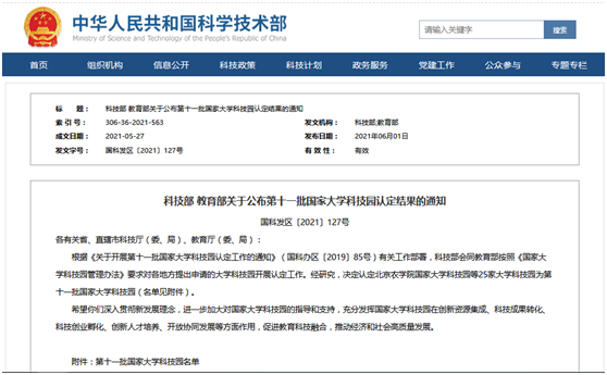 6月1日,科技部、教育部联合发布《科技部 教育部关于公布第十一批国家大学科技园认定结果的通知》(国科发区〔2021〕127号),华体会体育官方网站科技园被认定为“国家级大学科技园”,这是江西省第四家,也是我省除省会城市外唯一一家获批的国家级大学科技园。