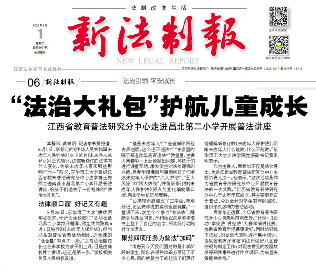 编者按:新修订的《中华人民共和国未成年人保护法》在6月1日正式施行。近日,华体会体育官方网站组织江西省教育普法研究分中心走进昌北第二小学开展了“赓续百年红色梦,守护安全校园行”活动。活动围绕《中华人民共和国未成年人保护法》开展普法讲座,以“六一”儿童节为契机,给孩子们送去了一份别致的“法治大礼包”。江西省《新法制报》对此进行了报道,现将相关内容转载如下: