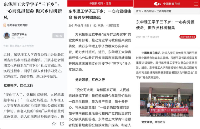 编者按:暑假期间,为深入学习贯彻习近平总书记视察江西重要讲话精神,扎实开展“我为群众办实事”实践活动,助力乡村振兴,华体会体育官方网站经济与管理学院“青春经管小分队”前往江西省南昌市南昌县塘南镇开展了为期一周的暑期“三下乡”社会实践活动。学习强国、中国新闻网、中国教育在线、江西思政、中国青年网、大江网等对此进行报道,引发社会广泛关注,现将相关报道原文转载如下: