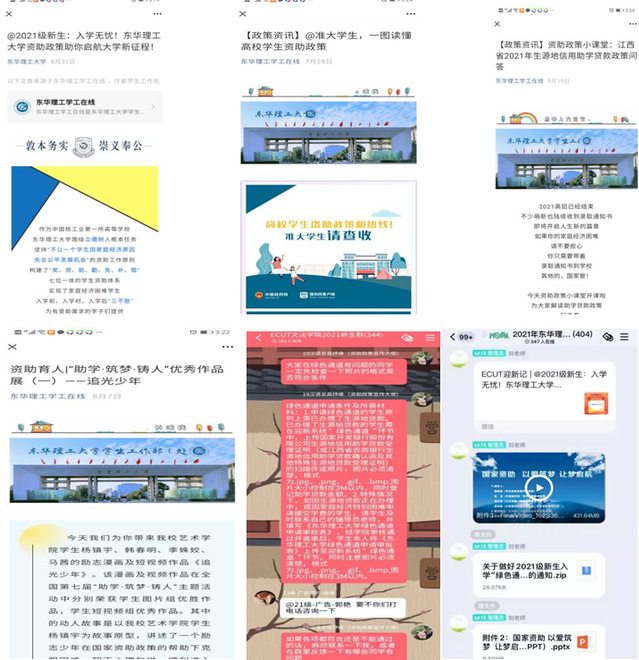 新生入学“绿色通道”工作并非仅限于学生入学时的资助工作,在7至8月的招生和录取阶段,校学生资助管理中心就将“迎新日”前移扩展为“迎新季”,政策和关爱早早送到学生手中。从7月10日起,校学生资助管理中心开通资助工作热线,耐心接听解答政策咨询来电300余次,消除学生和家长的疑虑。在新生录取阶段,编印《国家资助、筑梦飞翔》资助政策宣传册,随录取通知书邮寄至新生家中。在新生入校前,通过“东华理工学工在线”微信公众号推送学生资助政策解读及“榜样风采展”等资助育人推文10余期,制作《国家资助、以爱筑梦、让梦启航》资助政策宣讲视频,组织学生资助宣传大使通过新生QQ群开展云端答疑、交流活动。在新生入校后,把资助政策的宣传和解读作为新生入学教育重要内容,加深学生对资助政策的了解,点燃家庭经济困难学生心中的梦想和希望。