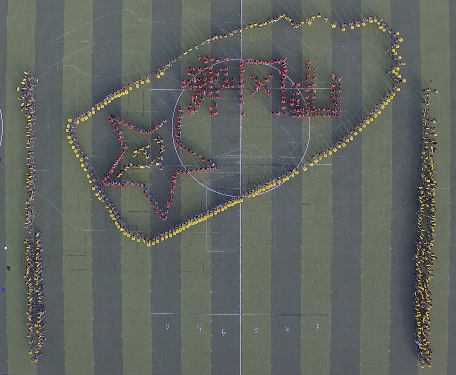 看!朝气蓬勃!750名青年学子组成的学生方队在操场上整齐排列,昂首挺胸、迅速移动、变换手势,一系列动作一气呵成,一艘南湖红船跃然在绿油油的运动场上。“南湖红船”“井冈红旗”“星星之火”“长征路线图”“建党100周年”……学生们通过变换队形表演了“红心向党”团体操,一个个图案再现了中国共产党的成长“坐标”,总结回顾了党一路走来的艰难历程,不同方队展示了全体师生爱国爱党爱校的真挚情感和昂扬向上的精神风貌。