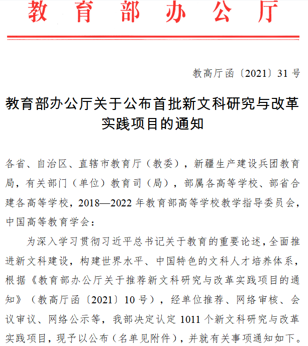 近日,教育部发布了《教育部办公厅关于公布首批新文科研究与改革实践项目的通知》,我校经济与管理学院熊国保教授申报的《新文科背景下地方行业特色高校经管类专业升级路径研究与实践》项目获批立项。