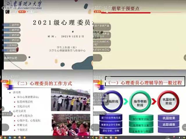 为进一步加强我校心理健康教育工作,建设一支具备心理自助和助人能力的心理委员队伍,充分发挥班级心理委员在心理问题识别、心理健康教育活动的组织等方面的作用,学工部(处)、心理咨询中心近日开展了2021级心理委员系列培训,全校400余名心理委员参加了培训。
