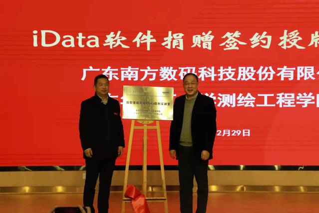 颁奖典礼结束后,还举办了南方数码科技股份有限公司向华体会体育官方网站测绘工程学院捐赠74套iData网络教育版软件的捐赠仪式。谢刚生、刘云海代表双方为新型基础测绘iData信创实训室进行揭牌。(图/邹新灿 文/邹小平)