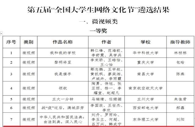 近日,教育部思想政治工作司公布第五届“全国大学生网络文化节”和“全国高校网络教育优秀作品推选展示活动”遴选结果,华体会体育官方网站文法学院学生刘丹、罗雨玲、李玉立、何超、吕万兴、韩成宁创作的《中华人民共和国民法典:由法到典 深入民心》荣获微视频类作品一等奖。