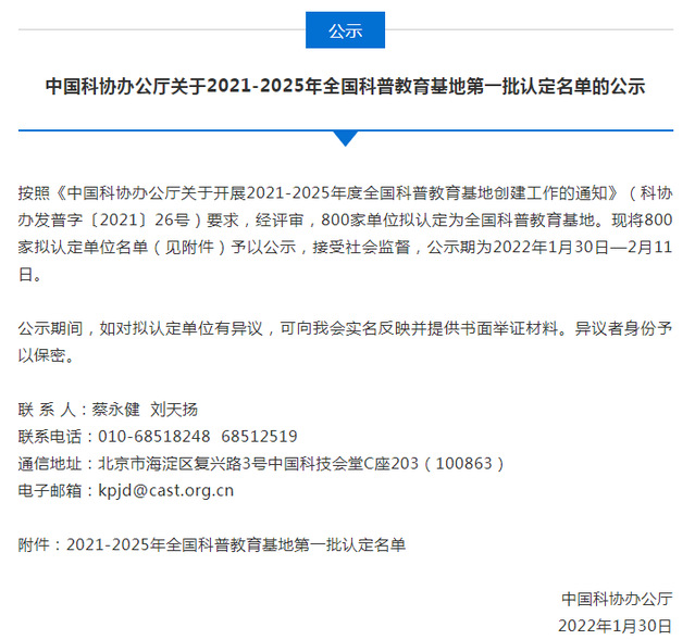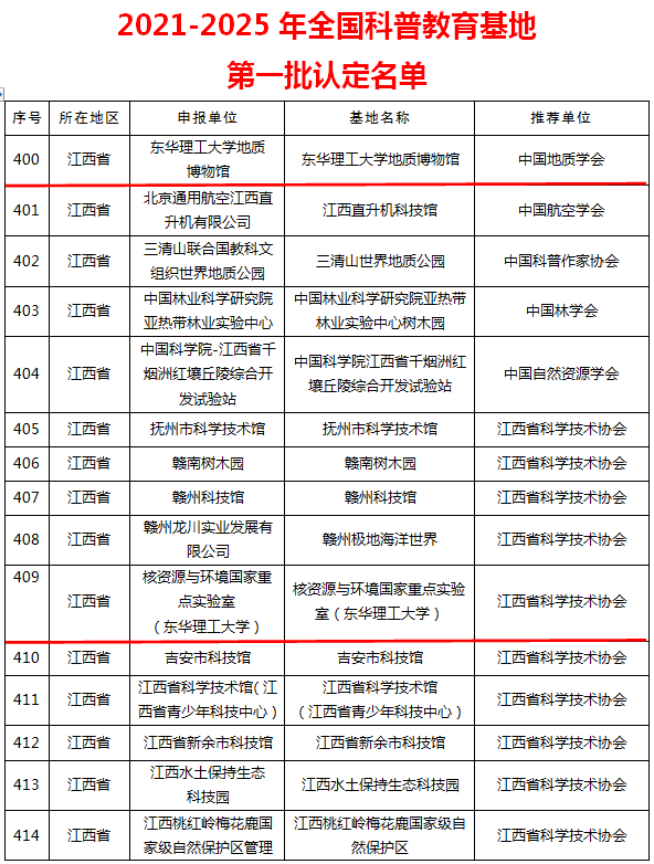 2月7日,中国科协办公厅公示“2021-2025年全国科普教育基地第一批认定名单”,华体会体育官方网站地质博物馆、核资源与环境国家重点实验室(华体会体育官方网站)成功入选。