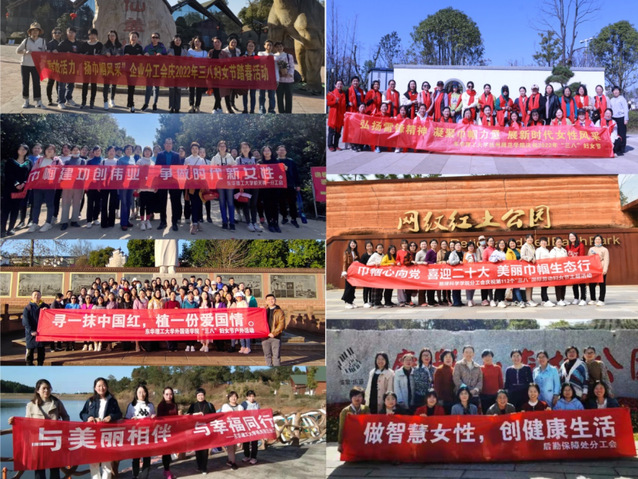巾帼力量强,基层活动忙。节日期间,学校27个基层工会相继开展了“巾帼建功月”系列活动。软件信工、学团分工会通过观影活动激励女教职工在日常学习工作生活中,永葆“闯”的精神、“创”的劲头,勇当排头兵,争当红旗手,为学校高质量跨越式发展持续贡献力量;经管、土建学院分工会通过学习茶艺知识、茶器鉴赏和使用,把日常饮茶引向健康化和艺术化,提升美好生活品质;重点实验室、理学院女教职工在专业老师的示范指导下,饶有兴致地制作甜点;机电、测绘学院分工会开展了插花比赛;机关一、机关二、机关三、地控、地科、图书馆分工会开展了“感受田园风光,倡导绿色生活,助力农户增收”春游踏青果蔬采摘活动;师范、外国语、企业、后勤分工会开展了“亲近自然,走出健康”绿色低碳健步走活动;文法学院分工会带领女教师们学习健美操,缓解疲劳;水环学院分工会开展了绿色低碳植树活动;马院分工会开展了“唱响主旋律、红歌颂祖国”活动,用诚挚的热情为祖国送上深情祝福。