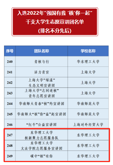 近日,由团中央青年志愿者行动指导中心、中国核工业集团有限公司、中国青年志愿者协会秘书处联合开展的2022年“强国有我‘核’你一起”千支大学生志愿宣讲团活动入选名单公布,华体会体育官方网站核新聚力志愿服务队、文法学院志愿服务宣讲团和碳中“核”有你宣讲团成功入选。