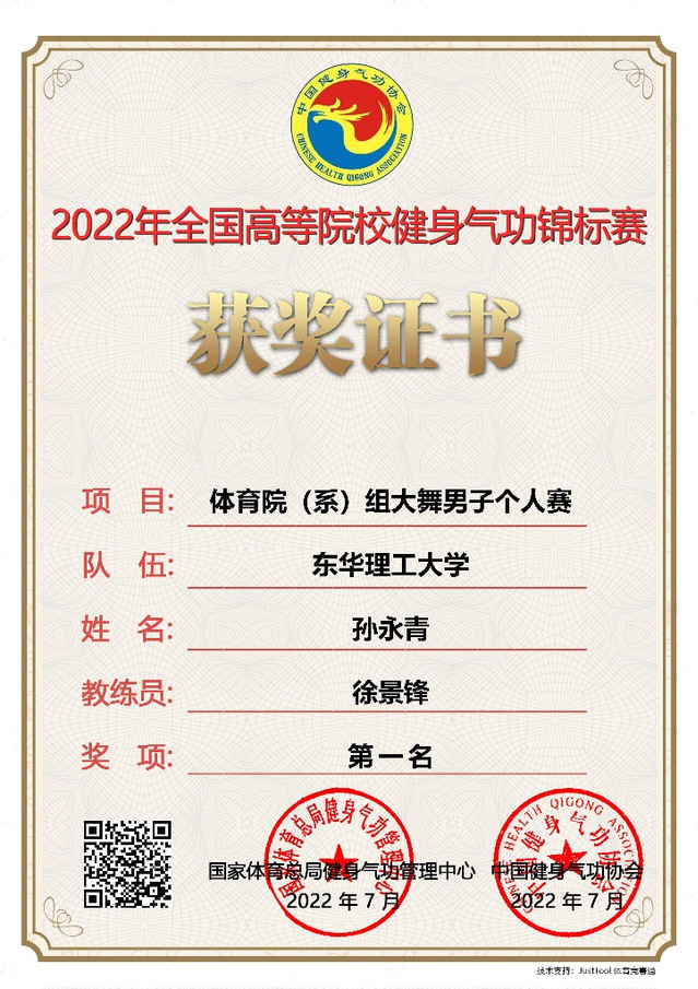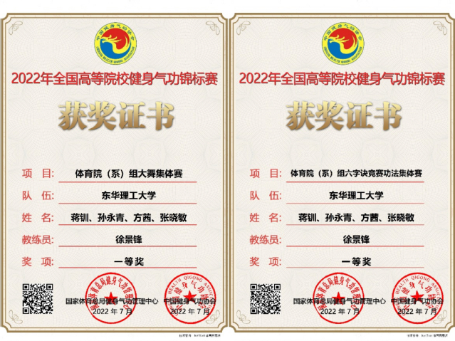 近日,由国家体育总局健身气功管理中心、中国健身气功协会主办的2022年全国高等院校健身气功锦标赛圆满落幕。我校由蒋钏、孙永青、张晓敏、方茜四位同学组成的健身气功队表现优异,斩获大舞集体赛一等奖1项、六字诀竞赛**集体赛一等奖1项,个人获得男子大舞比赛第一名和多项前八名的优异成绩,均创历史新高。