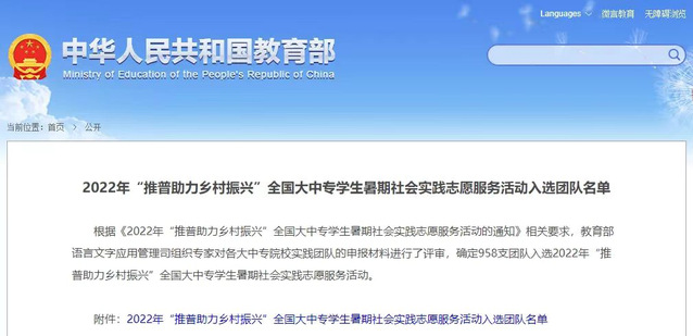 近日,教育部网站发布《2022年“推普助力乡村振兴”全国大中专学生暑期社会实践志愿服务活动入选团队名单》,我校文法学院“普惠乡村”服务队与“经典润乡村”服务队成功入选。