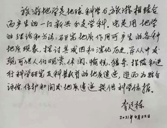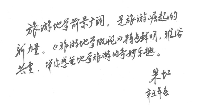 中国自然资源作协专家陈跃康(笔名:绿野来客)为此书作诗一首“叩开新时代旅游地学之门”,诗中提到“有幸诸君同努力,陈老梦想终成真。教材编写责任重,一片荒原待开垦”,突出了该本教材在继承前人基础上对旅游地学学科未来发展的重要地位。“院士题字点主题,时代背景两山论;地学旅游展业态,江山更待育新人”,强调了该专业领域内学者对此书的重视及肯定,同时表达了对培育优秀学科新人的美好愿景。