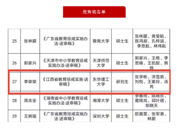 近日,“全国法学学生模拟立法大赛”主办方湘潭大学公布关于第一届全国法学学生“东放明”杯模拟立法大赛活动结果,我校文法学院李荣荣、张学彬、洪雪爽、刘悦、王紫玲、汤芮团队的参赛项目《江西省教育惩戒实施办法·送审稿》(指导老师:谢青霞)成功进入复赛,获得“东放明”杯模拟立法大赛的优秀奖。