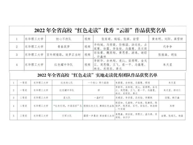 近日,省委教育工委、省教育厅公布了2022年全省“青春献礼二十大 强国有我新征程”主题教育实践活动评选结果,我校功勋“七二一”班入选“红色班级”创建试点(全省仅10所学校入选);4支队伍创作的作品被评选为“红色走读”优秀“云游作品”;荣获“红色走读”实地走读优秀团队作品一等奖2项、二等奖2项、三等奖1项,获奖总数居全省高校前列。
