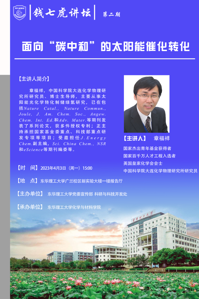 应化学与材料学院邀请,国家杰出青年基金获得者、国家百千万人才工程入选者章福祥做客华体会体育官方网站,以“面向‘碳中和’的太阳能催化转化”为主题,向我校师生讲述太阳能催化转化相关知识。欢迎全校师生届时前往聆听。