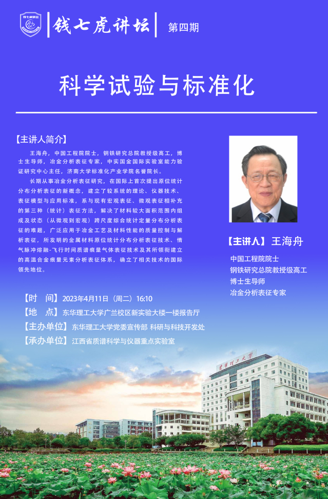 应江西省质谱科学与仪器重点实验室邀请,中国工程院院士、钢铁研究总院教授级高工、博士生导师、冶金分析表征专家王海舟做客华体会体育官方网站,以“科学试验与标准化”为主题,向我校师生讲述科学试验相关知识。欢迎全校师生届时前往聆听。