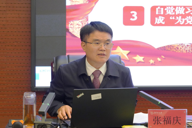 张福庆紧密联系学校实际,结合自身学习思考,从深刻领会习近平新时代中国特色社会主义思想的精髓要义,准确把握党中央赋予高等教育的重大使命;坚持用习近平新时代中国特色社会主义思想指导实践,奋力推进特色高水平大学建设;自觉做习近平新时代中国特色社会主义思想的践行者,出色完成“为党育人、为国育才”历史使命等三个方面进行了阐述。