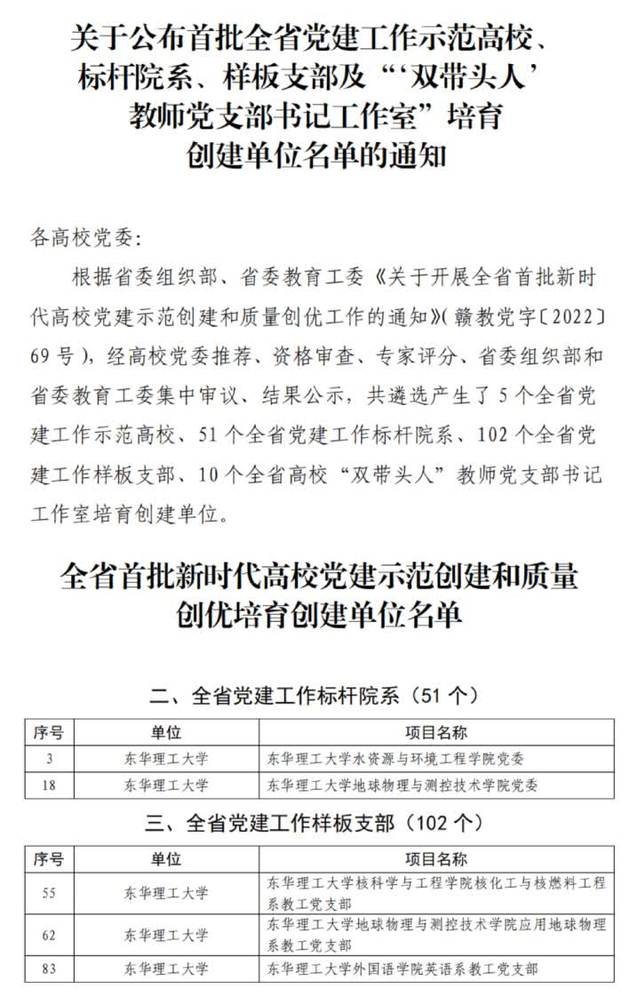 近日,省委组织部、省委教育工委公布了首批全省新时代党建示范创建和质量创优培育创建单位名单。华体会体育官方网站地球物理与测控技术学院党委、水资源与环境工程学院党委入选为“全省党建工作标杆院系”培育创建单位,地球物理与测控技术学院应用地球物理系教工党支部、核科学与工程学院核化工与核燃料工程系教工党支部、外国语学院英语系教工党支部入选为“全省党建工作样板支部”培育创建单位。