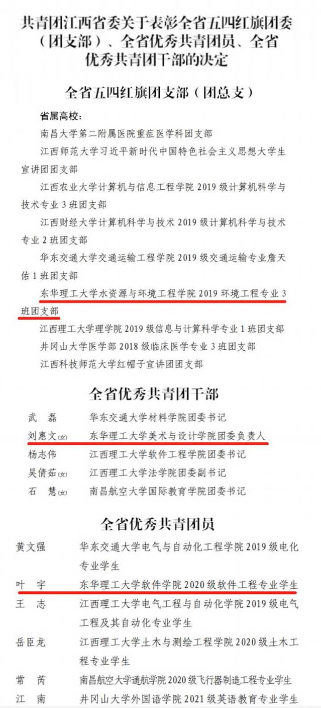 近日,共青团江西省委印发了《共青团江西省委关于表彰全省五四红旗团委(团支部)、全省优秀共青团员、全省优秀共青团干部的决定》(赣青发〔2023〕6号),对2022年度全省共青团先进典型进行表彰,华体会体育官方网站水资源与环境工程学院2019环境工程专业3班团支部获2022年度“全省五四红旗团支部”称号;美术与设计学院刘惠文老师获“全省优秀共青团干部”称号;软件学院叶宇同学获“全省优秀共青团员”称号。