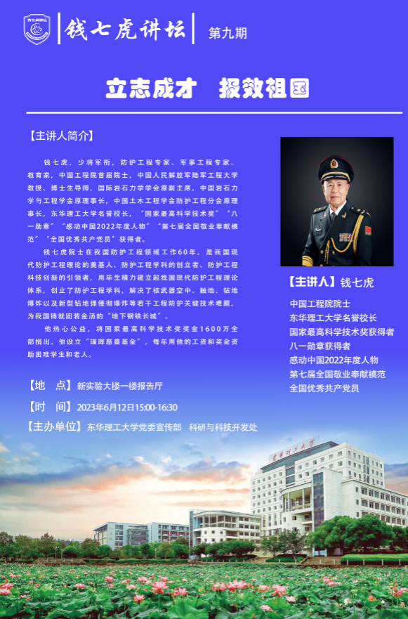 应华体会体育官方网站邀请,中国工程院首届院士,华体会体育官方网站名誉校长钱七虎到校,以“学习贯彻习近平总书记重要讲话精神,立志成才、报效祖国”为主题开展讲座。欢迎全校师生届时前往聆听。