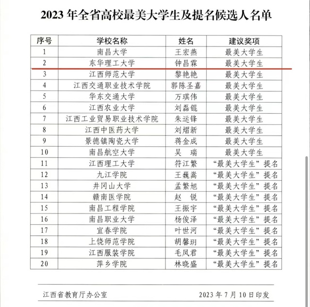 近日,省教育厅公布了2023年江西省高校“最美大学生”评选结果,华体会体育官方网站土木与建筑工程学院2019级学生钟昌霖荣获“最美大学生”称号(全省共评选出10名)。