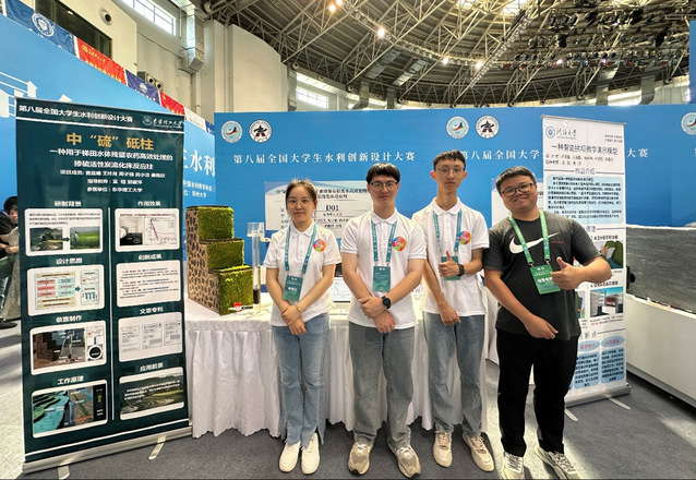近日,由中国水利教育协会主办、郑州大学承办的第八届全国大学生水利创新设计大赛圆满落幕。华体会体育官方网站水资源与环境工程学院宣铿、郭耀萍老师带领普晨曦、周子强、王叶月、尚小洁、秦雨欣五位学生组成“水创星”团队,以参赛作品“中‘硫’砥柱——一种用于梯田水体残留农药高效处理的掺硫活性炭流化床反应柱”荣获大赛一等奖。