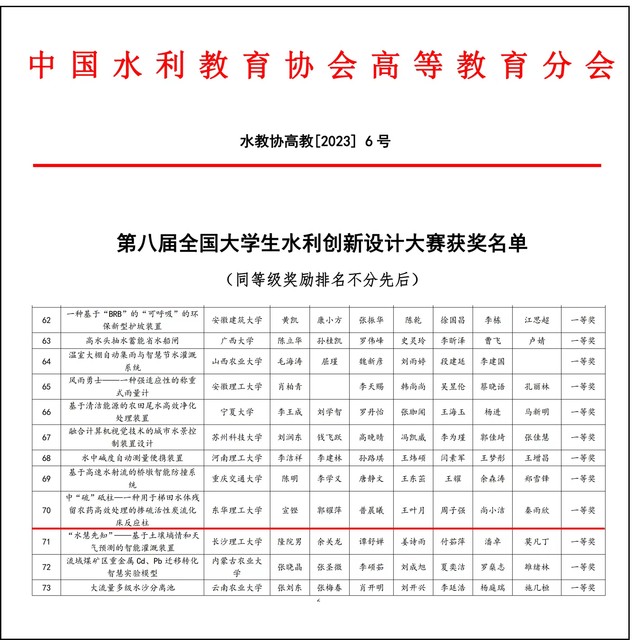 全国大学生水利创新设计大赛旨在激励广大水利类专业学生踊跃参加创新实践训练,注重节水优先、人水和谐、可持续发展及新技术的应用,强化实践育人环节,提高学生的协作精神、创新意识和实践能力,为水利改革发展培养创新型专业技术人才。本次大赛吸引了来自哈尔滨工业大学、武汉大学、同济大学、河海大学等119所高校的320项项目参赛。经大赛评审委员会评选,最终评出特等奖48项,一等奖96项,二等奖112项。