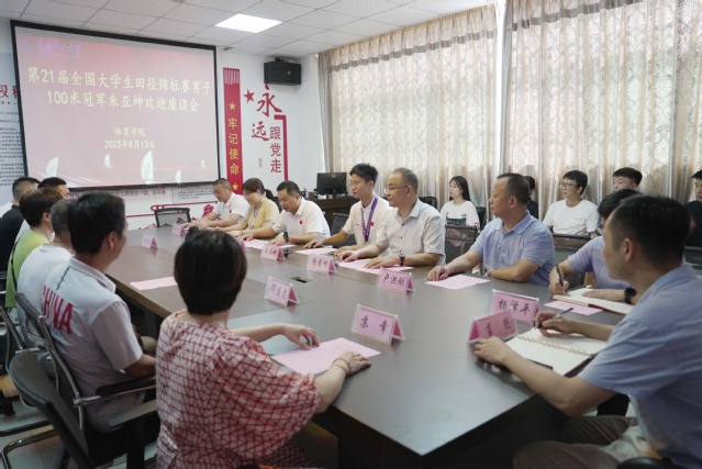 8月13日下午,华体会体育官方网站在南昌校区举行第21届全国大学生田径锦标赛冠军运动员朱亚坤凯旋欢迎会。华体会体育官方网站校长徐景坤出席欢迎仪式并讲话。校党委常委、副校长刘云海主持欢迎仪式及座谈会。