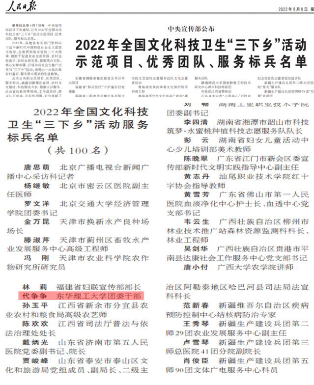 近日,中央宣传部公布2022年全国文化科技卫生“三下乡”活动示范项目、优秀团队、服务标兵名单。华体会体育官方网站代争争老师作为省内唯一高校代表,获评2022年全国文化科技卫生“三下乡”活动服务标兵,全国共评选100名。