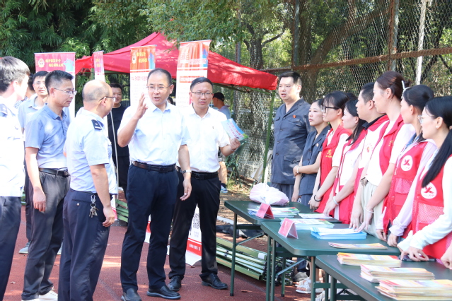 徐景坤一行深入军训场地和教学楼,亲切慰问了军训新生、承训教官和军训工作人员,同时查看了学生上课情况。随后,徐景坤参观了“反邪教宣传教育进校园”宣传活动现场,并与抚州市委政法委、抚州市中级人民法院、抚州市公安局、临川区委政法委、高新区政法办、东临新区政法工作办公室等有关单位负责同志进行了亲切交流。