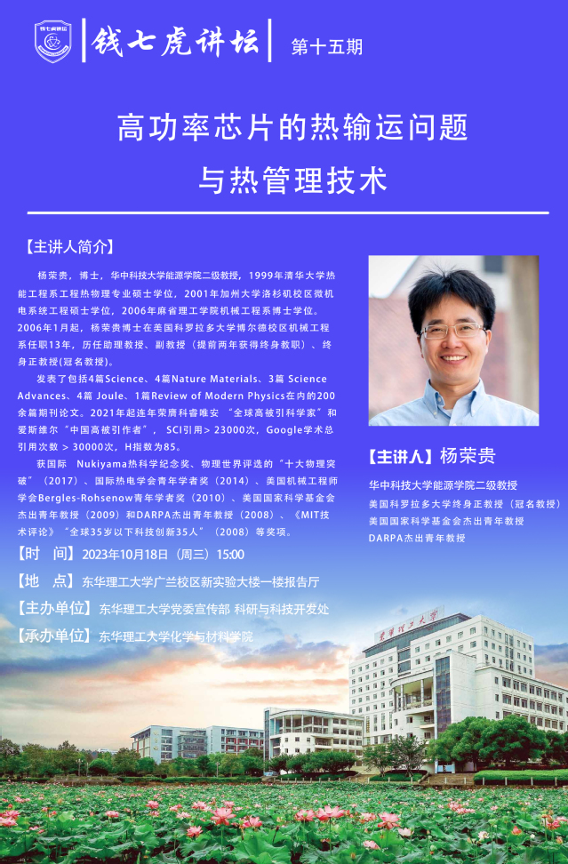 应党委宣传部邀请,华中科技大学能源学院二级教授杨荣贵来到“华体会体育官方网站”,以“高功率芯片的热输运问题与热管理技术”为主题开展讲座。欢迎全校师生届时前往聆听。