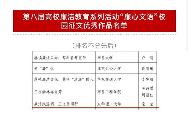 为深入学习贯彻党的二十大精神,贯彻落实党中央《关于加强新时代廉洁文化建设的意见》,近日,教育部以“廉洁润初心 铸魂担使命”为主题,举办了第八届高校廉洁教育系列活动。华体会体育官方网站师范学院2021级教育管理研究生金莹同学的作品《廉洁践澄明,正道勇同行》获评本次活动“廉心文语”校园征文优秀作品。