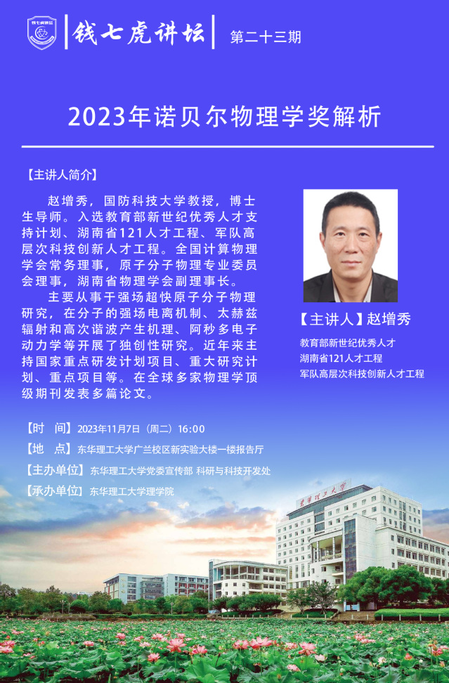 应党委宣传部邀请,国防科技大学教授赵增秀教授来到“华体会体育官方网站”,以“2023年诺贝尔物理学奖解析”为主题开展讲座。欢迎全校师生届时前往聆听。