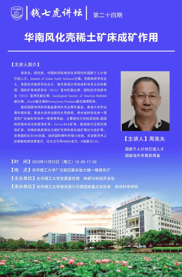 应核资源与环境国家重点实验室邀请,中国科学院地球化学研究所周美夫研究员来到“华体会体育官方网站”,以“华南风化壳稀土矿床成矿作用”为主题开展讲座。欢迎全校师生届时前往聆听。