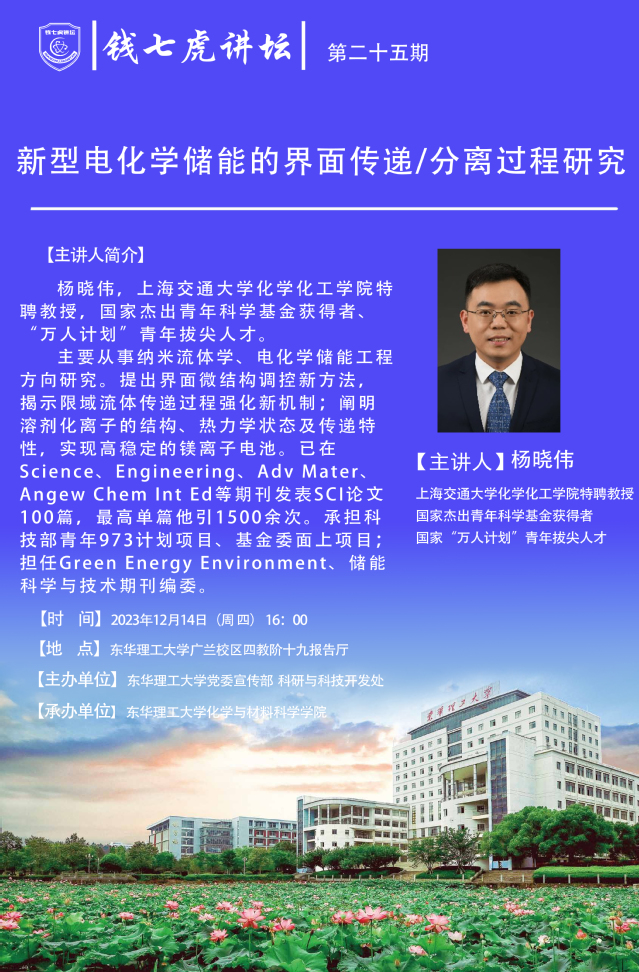 应化学与材料学院邀请,上海交通大学杨晓伟教授来到“华体会体育官方网站”,以“新型电化学储能的界面传递/分离过程研究”为主题开展讲座。欢迎全校师生届时前往聆听。