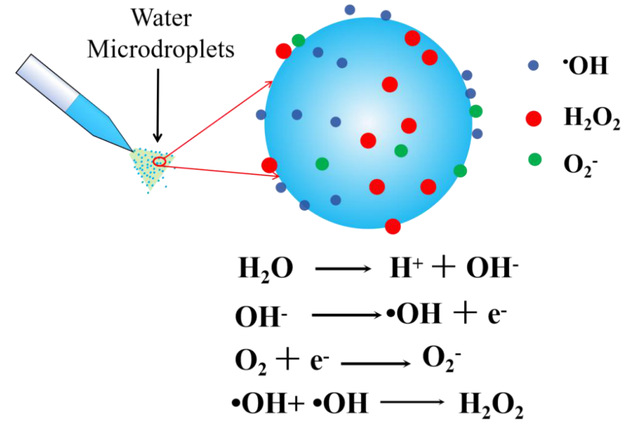 此外,作者还发现在微水滴界面电子可自发从OH-转移到空气中的O2,形成多种活性氧自由基(ROS)如: •OH (230.25 μM/min)、H2O2 (152.5 μM/min) 和 1O2 (•O2, 0.11 μM/min)。作者利用此过程产生的ROS去除环境中的有机污染物(罗丹明B(RhB)、亚甲蓝、尼罗蓝和荧光素),研制的离子源阵列雾化装置可增加ROS产量,能够在4小时内完全降解2mL 100 μg/mL溶液中的RhB。此方法无需任何特殊外源材料(催化剂、纳米材料、紫外光、有机化学试剂),在常温常压下仅以水为原料制备了真正绿色的ROS,此部分研究内容已在国际著名期刊《Journal of Cleaner Production》(中科院1区Top,IF=11.1)发表。