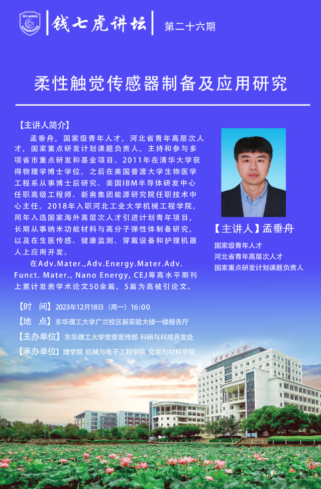 应理学院邀请,国家级青年人才孟垂舟教授来到“华体会体育官方网站”,以“柔性触觉传感器制备及应用研究”为主题开展讲座。欢迎全校师生届时前往聆听。