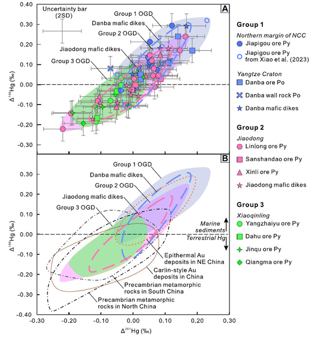 该文章选取华北和扬子克拉通三叠纪、早-晚侏罗世以及早白垩世等时期典型造山型金矿,对主成矿阶段硫化物及区域基性岩、花岗岩、变质岩系统开展了Hg同位素分析。结果显示,不同俯冲条件下形成的造山型金矿Hg同位素组成差异明显(图2):1)形成于洋壳俯冲背景下的克拉通边缘造山型金矿相对富集199Hg(△199Hg>0);2)形成于陆壳俯冲背景下的克拉通边缘造山型金矿相对亏损199Hg(△199Hg<0);3)形成于兼具洋壳和陆壳俯冲背景的克拉通边缘造山型金矿兼具以上两者特点。更为重要的是,不同成矿带矿石和基性岩具有一致的Hg同位素特征。Hg-S-Pb-Nd等多元同位素分析也表明花岗岩和变质基底不是主要的成矿金属源区。以上表明,金矿物质来源于洋/陆壳交代的岩石圈地幔,不同俯冲过程影响的金矿岩石圈地幔源区具有显著差异,交代地幔脱挥发分或基性岩浆脱气形成了成矿热液。研究证明克拉通边缘高级变质岩区是造山型金矿重要勘探靶区。