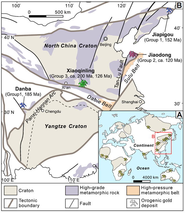 图1 克拉通边缘造山型金矿分布图(A)和本次研究采样位置图(B)