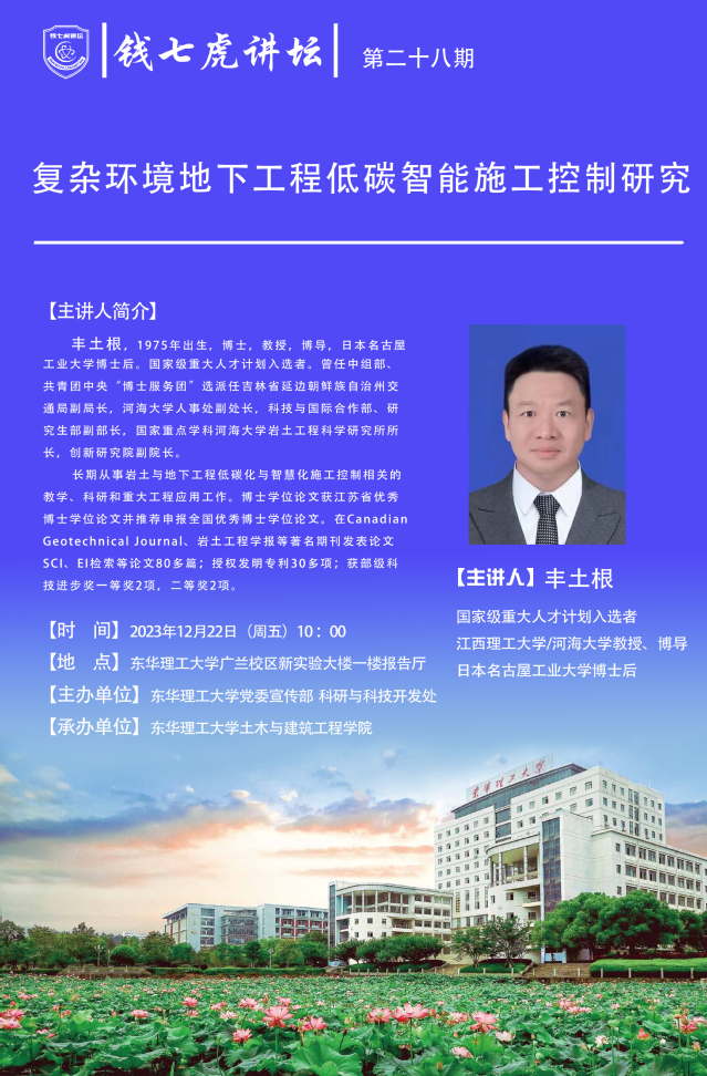 应土木与建筑工程学院邀请,国家级重大人才计划入选者丰土根教授来到“华体会体育官方网站”,以“复杂环境地下工程低碳智能施工控制研究”为主题开展讲座。欢迎全校师生届时前往聆听。