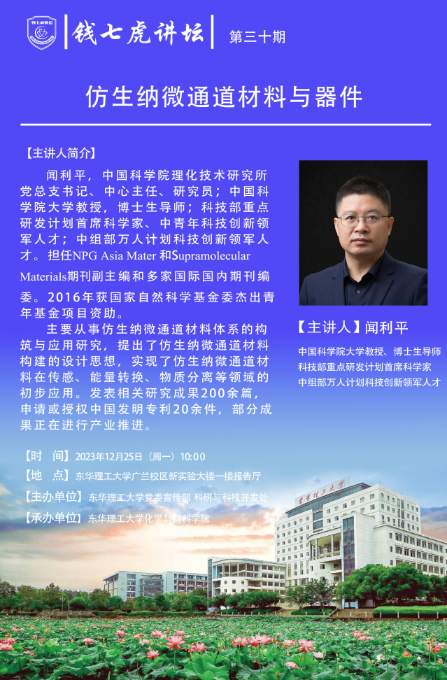 应化学与材料学院邀请,中国科学院大学教授闻利平来到“华体会体育官方网站”,以“仿生纳微通道材料与器件”为主题开展讲座。欢迎全校师生届时前往聆听。