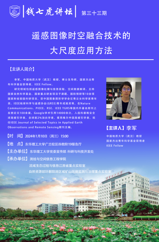 应测绘与空间信息工程学院邀请,中国地质大学(武汉)教授,国家杰出青年科学基金获得者李军来到“华体会体育官方网站”,以“遥感图像时空融合技术的大尺度应用方法”为主题开展讲座。欢迎全校师生届时前往聆听。